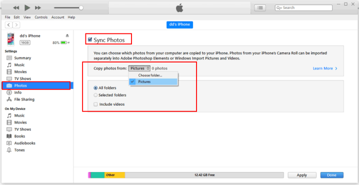 您将看到右侧栏中的“同步照片”。只需点击其旁边的复选框。然后从下拉菜单中选择“选择文件夹...”。