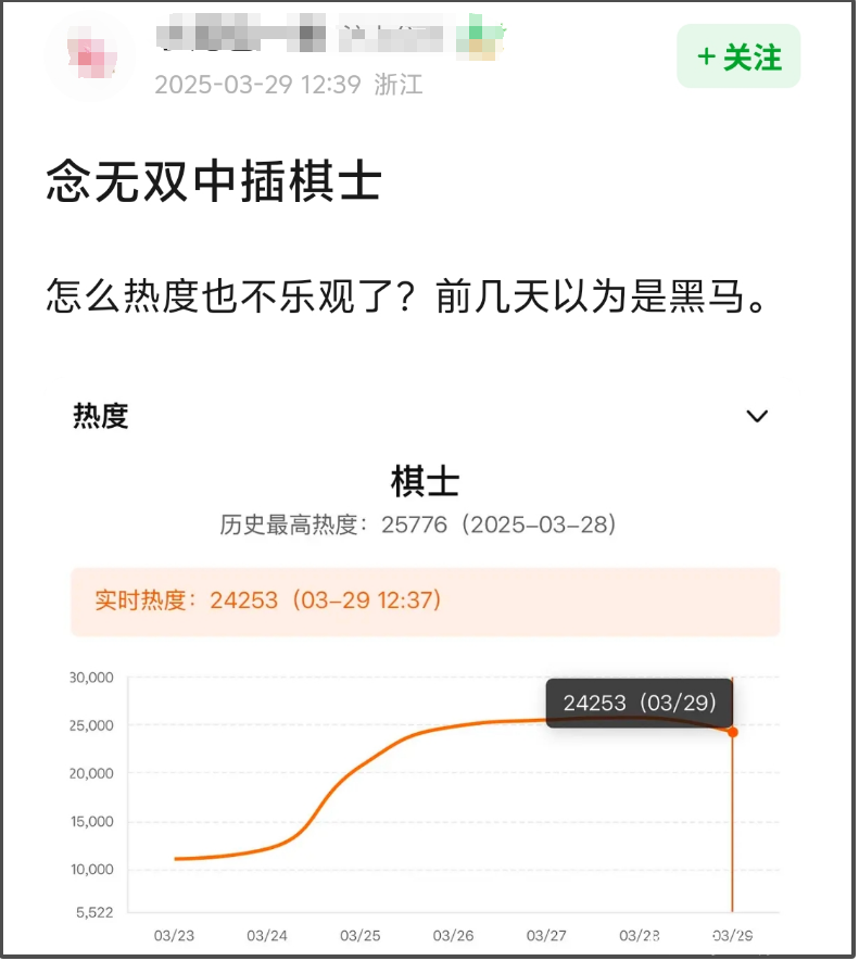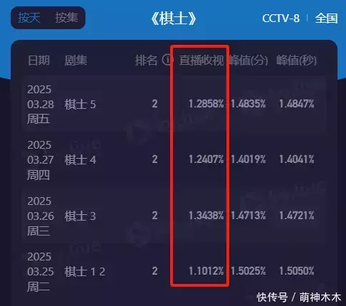 《棋士》剧集热度横盘了,卡在2万多,还没冲上3万;央视收视也是起起伏伏,突破了1.34%之后又跌回了1.28%。