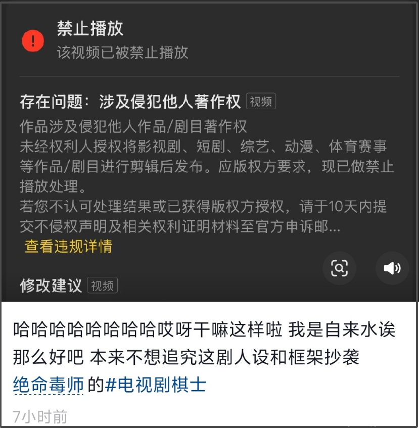 按说《棋士》只是被质疑了一下抄袭,卷入了一下风波,不至于到别人说两句都不行,偏偏他们就是干了,拿着名誉权、版权投诉捂嘴,本来网友都不想追究了,结果愣是被剧方搞得逆反了。